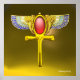 Símbolo egípcio da vida eterna Ankh com asas azuis ouros, motins de milho e gemstone vermelha vibrante.design de joia elegante em fundo amarelo, parte da coleção Hyper Talismans. modelagem, design e renderização por parte do Búlgaro Lumini. c)