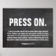 Fundo do quadro, poster verso de Bíblia personalizado com Philippians 4:13 com as palavras "Press On" em letras grandes. Esta poster cristã moderna pode ser personalizada. Mude o texto para a sua passagem favorita. "Eu pressiono em direção ao objetivo de ganhar o prêmio pelo qual Deus me chamou de Céu em Jesus Cristo."
