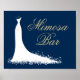 Sinal de exposição do bar de mimosa para chá de noiva / cartaz para noiva chique apresenta um design de vestido de noiva fluido, texto que pode ser personalizado. Cores branco, azul-marinho (personalizável) e dourado champanhe.