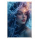 Um retrato místico de uma mulher com seu rosto afundado, parcialmente escondido por cabelos fluidos, brilhantes e delicados tendões de fumaça mágica. A luz estelar macia toca a sua bochecha e lábios, enquanto uma paleta sonhadora de blues, púrpura, e pistas de evoques de laranja de outra beleza mundana. Altamente detalhado, encantador e surreal.