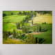 Poster de um enrolamento de ziguezague, uma árvore ciprestes a atravessar os campos verdes em Monticchiello, na Toscana, em Itália.