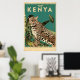Estilo Anônimo Único Poster de viagens de Aviação do Quênia, com um pimento de leopardo ou pantera pintado entre folhas tropicais sobre um fundo azul-Aqua profundo