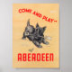 Poster de Viagens vintage da Aberdeen Scotland com um bonito Terrier Dog escocês brincando na praia.