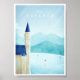 Poster de viagens de estilo Vintage do Castelo Neuschwanstein na Baviera. Esta ilustração do inverno, o mais belo castelo de conto de fadas da Europa, inclui figuras a patinar num lago congelado e montanhas à distância. O texto diz Visite a Baviera. Imagem original desenhada e digitalmente reproduzida por Henry Rivers para Poster de viagens Co.
