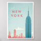 Poster de viagens do estilo Vintage de Nova Iorque e o famoso Empire State Building. O texto diz Visite Nova Iorque. Ilustração desenhada à mão original e desenhada digitalmente por VintageTravelPosters.co.