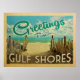 Esta design do cartão postal Vintage da zona do Golfo apresenta uma praia arenosa com uma bela água turquesa oceânica e acima do mar, um céu azul com nuvens brancas onduladas. No estilo viagens vintage.