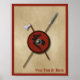Uma renderização em 3d de um escudo Viking junto com um machado de batalha e lança sobrepostos a um papel antigo ou imagem de fundo pergaminho. O escudo é decorado com um corvo preto (Corvus corax) pintado em couro vermelho. Adicione seu próprio texto. Os métodos e materiais utilizados na construção de escudos Viking variaram de local e de tempo. Esta reconstrução baseia-se em exemplos conhecidos. Os escudos nórdicos, em contraste com os feitos por outros grupos, eram frequentemente feitos de madeiras relativamente suaves, como poplar e pássaro. Intencional ou não, isso ajudou o escudo a absorver o sopro sem falhar. E, em vez de um pedaço sólido de madeira, foram acoplados plamentos horizontais - como indicam as cabeças de parafuso vistas na frente desse escudo - para evitar cuspir ao longo do grão. A fim de reduzir ainda mais a possibilidade de danos, a face do escudo foi coberta frequentemente por couro e foi acrescentada uma faixa de couro. Ambos absorvidos sopram, protegendo a madeira subjacente. O chefe de metal em forma de tigela no centro protegeu a mão do guerreiro.