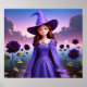 Esta poster de capricho apresenta uma jovem bruxa num vestido roxo e apontou o que está entre rosas roxas escuras, evocando temas de magia, mistério e fantasia. Terminado como um impressão de arte mestiço.