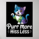 Este gráfico atraente mostra um gato animado com pele nitidamente segmentada em tons de azul, roxo e verde, adornada com uma gravata de arco multicolorida pontilhada por polca. O gato tem olhos encantadoramente desiguais - um azul, um amarelo - e uma expressão feliz, de boca aberta, com uma pata brava. Abaixo do felino, o texto branco ousado transmite uma mensagem encorajadora: "Purr More Hiss Less", defendendo um comportamento positivo e pacífico. Pequenos sotaques traços rodeiam o texto, e todo o design é colocado sobre um fundo preto sólido. Download digital apenas para uso pessoal.