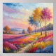 Uma pintura de paisagem encantadora que explode com as alegres cores do primavera. Colinas rolantes são enfeitadas com uma tapeçaria de flores silvestres florescentes em tons de fúcsia, lavanda, ouro e ceruleu. Um caminho suave atravessa uma flora vibrante, levando o olho para uma linha de árvores graciosas com folhagem pintada em tons brilhantes de amarelo, azul e rosa. O céu acima é um espetáculo de pastéis macios, com pântanos de nuvens banhadas no brilho quente do amanhecer ou do anoitecer, criando uma atmosfera serena, porém viva. Este trabalho de arte capta a essência de um sonho como o springtime, convidando os espectadores a mergulharem em sua beleza e tranquilidade.
