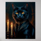 Bring the grandeur of medieval art into your home with this medieval style gallery wall art print. Victorian elegant gothic black cat with piercing, glowing amber eyes, set against a dark matte background. The portrait creating a moody dark academia aesthetic with cinematic lighting.