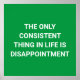 "A única coisa consistente na vida é a decepção." é uma curiosa citação desanimadora aqui em uma base verde.
