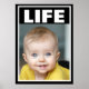 Esta é uma bela imagem pró-vida de um bebê sorridente com uma camisa amarela e olhos azuis. A palavra LIFE está acima. Uma borda preta e branca envolve a imagem. Todo texto e fontes podem ser modificados.