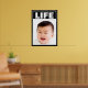 Esta é uma bela imagem pró-vida de um bebê sorridente com cabelo escuro. A palavra LIFE está acima. Uma borda preta e branca envolve a imagem. Todo texto e fontes podem ser modificados.