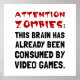 Nerd de gamer de computador e geeks de console piada?Atenção zumbis este cérebro já foi consumido por videos games? Veja este design personalizado engraçado em camisetas, camisas, canecas, capas, presentes e roupa.