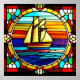 Ilustração detalhada e vibrante de vidro manchado de um veleiro contra um pôr do sol colorido sobre um mar calmo, bordado por intrincados padrões geométricos e cores vibrantes, evocando a paz e a arte.