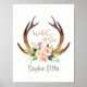 Esta impressão de arte parece rústica e elegante. O veado e o buquê rosa estão em aquarela. Personalize com o nome do seu filho.