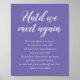 Este elegante sinal de memorial roxo vinca e branco é uma maneira bonita de lembrar e homenagear aqueles amigos e familiares que partiram, mas que você sempre amará e lembrará, com este tocante poema “Até que nos encontremos novamente”. Inclua-o, junto com fotos dos falecidos, em uma mesa de memória.