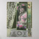 Foto de um cartão postal de tecido, imagem de uma menina, e um euro se eu mantiver uma tosse verde no meu coração, então o pássaro cantor virá € no exterior. Lace e botões aparecem em volta da antiga foto de moda.