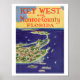Imagem colorida da Vintage de Key West Florida adaptada a partir de uma peça publicitária de viagem de 1920 mostra Key West a partir do oeste, olhando para trás através de Stock Island e das pontes ferroviárias. O texto diz: Key West e Monroe County Florida, em caracteres de mão antigos. Os barcos estão por toda a ilha e as casas estão em ruas bem definidas. Imagem histórica do excelente Key West.