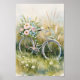 Uma delicada, branca, pintura aquosa de uma bicicleta vintage, sua estrutura metálica angustiada adornada com um monte de flores abarrotadas pelo pastel, incluindo rosas cor-de-rosa macia, nozes-me-esqueço de azul-bebê e margaridas verdes-menta, descansando em uma serena cheia de luvas, meadas e espalhando flores silvestres brancas e delicadas. A cena deve evocar um sentimento de nostalgia e de perspicácia, com uma qualidade vintage desbotada que lembra uma tarde de verão esquecida. A paleta deve apresentar uma mistura suave e tranquila de tons pastéis úmidos, incluindo pinks pálidos, blues macios e verdes mosquitos, com toques de bege branco cremoso e quente. As pinceladas devem ser soltas e expressivas, com textura visível e mistura sutil, capturando a essência etérea e sonhadora da cena.