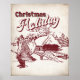A vintage illustration of a cozy winter season with a wooden cottage in the woods and a Santa Claus.
