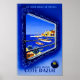 Poster de viagens vintage restaurada e melhorada digitalmente mostrando uma vista, a partir de uma janela de trem, de embarcações de navegação em uma baía na Rivera Francesa. Imperfeições removidas. Cores corrigidas. Imagem cortesia da Biblioteca do Congresso.