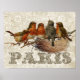 Cinco pequenos Robins europeus sentam-se juntos sobre um galho que ignora um ninho e a palavra "Paris" em belíssimas letras embelezadas. O padrão do ornamentado de safra no fundo vem de uma tapeçaria bordada antiga.