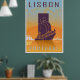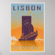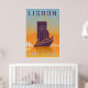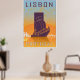 Poster vintage de Lisboa em fundo de cor laranja e azul com linha do horizonte branca