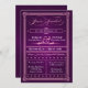 Este rico convite para casamento roxo, rosa suave e branco de beringela tem um sentimento antigo, antiquado, com design de cartas antiquado, incluindo elementos elaborados de escrita, uma faixa decorativa, estrelas e um amante suave. O convite para o rico é inspirado por posters de design e na moda. O texto diz: "Você é convidado para o casamento de [nome personalizável] & [nome personalizável] [data personalizável] [hora personalizável]. Por favor, junte-se a nós para uma Celebração Inesquecível". Personalize ainda mais o convite com a cerimônia de casamento e as informações e endereços de recepção, cada um na sua própria caixa com fronteiras pontilhadas.