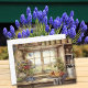 Imagem digital de uma safra, contador de cozinha rural com flores de aquarela, uvas roxas, cesto de maçãs em frente a uma bela janela olhando por cima de uma pastagem. Conteúdo genérico