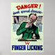 Um poster vintage pedindo aos cidadãos que tenham cuidado com a propagação da doença lambendo os dedos.