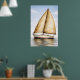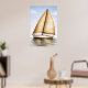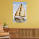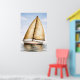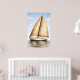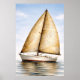 A vintage sailboat drifts across calm water beneath a muted blue sky, its sail rendered in warm beige tones with a subtle, unique newspaper-style texture. The full sail and low-set hull create a balanced nautical focal point, while soft washes and gentle reflections give the piece a quiet coastal feel. Suited for beach homes, lake houses, and cottages, this piece brings a serene maritime presence to the space.