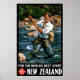 Poster de viagens restaurado e digitalmente melhorado mostrando um homem andando num rio e pescando. Imperfeições e lágrimas removidas. Cores corrigidas. Imagem cortesia da Biblioteca do Congresso.