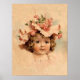 Um impressão vitoriano de uma jovem adorável com suas fechaduras de ouro saindo de um elaborado capô coberto de rosas rosa.
