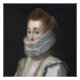 Uma mulher adornada com um suntuoso vestido elisabetano olha para fora, sua gola é exagerada para expressar o efeito que a moda tem nas meninas jovens. O intricado vestido sugere um alto status. Seus cabelos vermelhos são elegantemente penteados, complementando os ricos tecidos e detalhes ornamentais de sua vestimenta.
