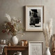 Faça uma declaração dramática com este impressão de arte preto e branco impressionante, uma verdadeira obra-prima da moda de vanguarda e expressão artística. A figura central chama a atenção com o seu especial penteado, óculos de sol brancos redondos icônicos, e um elegante corset preto enfeitado com nobres de metal proeminentes. Um contraste ousado é criado com um braço enfiado numa luva preta e o outro com uma granada manga branca, mostrando uma peça dominante sobre textura e silhueta. Enquadrada por duas figuras sombrias e minimalistas contra o pano de fundo de uma cinza limpa, essa peça expele um ar de mistério e sofisticada frieza. Em alto contraste monocromático, todos os detalhes, desde o estilo único da pessoa até as texturas sutis do vestuário, são destacados com precisão gráfica. Perfeito para espaços modernos, estúdios de moda, ou qualquer decoração que busque um toque de elegância suja, estilo único e uma poderosa narrativa visual.