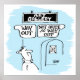 Visitante é abusado de sinais dizendo "saída", e "não muito longe" em uma galeria de arte. Um desenho animado da galeria de arte.