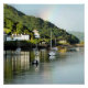 Depois de um dia de chuva, o sol finalmente sai e um arco-íris aparece no céu, nesta bela paisagem do porto de Aberdyfi no País de Gales, com barcos na água e algumas casas da vila.
