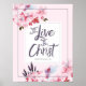 Design de tipografia caligráfica em letras negras elegantes com glifos de rico e alternativos e embate ornamental diz: "Viver é Cristo". Escritura é de Philippians 1:21. O design é rodeado por um belo quadro de flor de aquarela e um retângulo branco com guarnições.