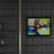 Vibrant and chaotic, the abstract composition bursts with vivid colors like blue, red, yellow, and green. Geometric shapes and overlapping brushstrokes create an energetic and dynamic scene.