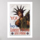 Poster patriótico da Primeira Guerra Mundial com a Estátua da Liberdade implorando o espectador para "... comprar a Liberty Bond Lest I Perish", por G.R. Macauley, 1917.