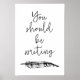 Poster preto e branco inspirador com "Você deve ser escrevendo" em uma fonte escrita à mão sobre uma represa.