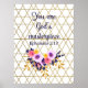 Você é a obra-prima de Deus em escrita azul com motivo floral, em um fundo branco com marcas de design de diamante. Esta design baseia-se em Ephesianos 2:10. Você é uma verdadeira obra de arte, uma pessoa singular criada por Deus Todo-Poderoso com um caminho e propósito específicos. Esta poster poderia ser um presente inspirador e encorajador para si mesmo, amigo ou membro da família.