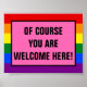 "Claro que são bem-vindos aqui!" lê a mensagem que sua empresa ou casa podem mostrar para mostrar que a homofobia e a intolerância não têm lugar em sua vida ou no seu negócio. Também disponível como poster se quiser ter certeza de que todos os seus clientes, vizinhos e comunidade sabem que a comunidade LGBTQ é bem-vinda. Mostre seu apoio à comunidade LGBTQ o ano todo. 20% do produto líquido do designer da venda deste item será doado para os Programas Comunitários de Juventude do Centro Comunitário de San Diego LGBTQ.