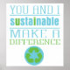 Texto verde e azul e símbolo de reciclar destacam VOCÊ e eu fazemos a diferença! As letras U e I são verdes na palavra sustentável azul. Dia da Terra, conservação, sustentabilidade e ser verde. Ajude o planeta!