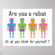 "Você é um robô ou pensa por si mesmo? Este é o ditado na design. O gráfico é de quatro robôs em cores de pop.