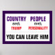 Campo sobre Trump. Pessoas sobre Personalidade. Trumpismo é uma relação ruim e tóxica. Lembre aos seus vizinhos que podem deixar Trump e Trumpismo para trás a qualquer momento, assim como deixaram um trabalho ruim. É hora de colocar todas as nossas pessoas sobre o seu culto genômico maligno narcisista da personalidade. Descrição da design: A camada de fundo é um roxo escuro, o que significa colocar pessoas sobre o partido político. Sobre isso há um retângulo branco com uma borda de cinza leve. O terceiro tem texto dividido em duas metades. No lado esquerdo, lê-se "Country over Trump". Do lado direito, lê-se: "Pessoas sobre personalidade." As palavras país e pessoas estão em fontes de sans serif roxas escuras, a palavra acima está em letra de estilo de escrita manual preta e as palavras Trump and Personality estão em fontes de sans serif vermelhas, ambas palavras aproximadamente do mesmo tamanho. Porque personalidade é uma palavra longa, significa que a palavra Trump está em um texto relativamente pequeno, fazer seu nome insignificante. Abaixo, que, no topo do terço inferior, está uma linha na mesma cinza de luz que a borda retangular. Abaixo dessa linha, em preto grande, todos os bonés sans serif font são as palavras, "Você pode deixá-lo." O mesmo design de ambos os lados.