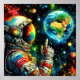 Um astronauta solitário flutua no espaço contra o nítido pano de fundo da Terra e numerosos corpos celestes. Cores vibrantes e detalhes intrincados capturam a vastidão e mistério do universo.