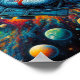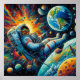 Um astronauta solitário flutua no espaço contra o nítido pano de fundo da Terra e numerosos corpos celestes. Cores vibrantes e detalhes intrincados capturam a vastidão e mistério do universo.
